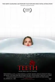 Teeth is a 2007 American comedy horror film written and directed by Mitchell Lichtenstein. The film stars Jess Weixler and was produced by Lichtenstein on a budget of $2 million.[1] The film premiered at the Sundance Film Festival on January 19, 2007, and received a limited release in the United States on January 18, 2008, by Roadside Attractions. Its title refers to the ancient trope of vagina dentata.