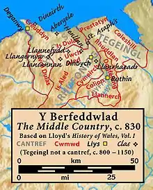 Comprising the three commotes of Rhuddlan, Prestatyn and Coleshill (Cwnsyllt),[2] the territory originally formed part of the Kingdom of Gwynedd until, in the late 8th century, it was conquered by the Anglo-Saxon Kingdom of Mercia. It remained under Mercian (or English) control for over three centuries until Dafydd ab Owain Gwynedd recovered it in the 12th century.[2] Edwin of Tegeingl (d.1073) was in the 11th century described as "lord" or "prince" of Tegeingl.[2] He was succeeded as lord of Tegeingl by his son Owain who supported the Anglo-Normans' invasion of North Wales in the 1090s.[3] The family remained powerful in North Wales until Owain's sons were killed in 1125 by a son of Gruffudd ap Cynan, Prince of Gwynedd.[4]