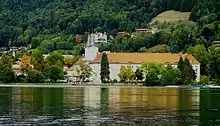 The buildings of the monastery itself were acquired in 1817 by king Maximilian I Joseph of Bavaria and later became a possession of the Dukes in Bavaria (a side branch of the ruling Wittelsbach family, the kings of Bavaria), attracted by the unusually beautiful location, and turned it into their summer residence. Known since then as Schloss Tegernsee, it is still the property of that family, the present owner is Prince Max, Duke in Bavaria. The building is home to the Herzogliche Bräustüberl brewery but also Tegernsee Grammar School the church of St. Quirinus, and a restaurant.[6] The brewery is owned by Duchess Maria Anna Henriette Gabrielle Julie in Bavaria, youngest daughter of the duke.