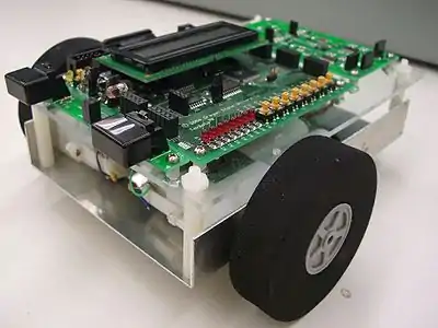 TekBots are centered on the Atmel microcontroller platform. This is the "brain" of the robot as it controls the robot's two motorized wheels allowing it to move. The robot's controller boards, wheels and all other peripherals are housed in an aluminum base.