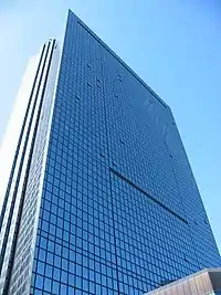 The complex consists of a central tower and two low rises that surrounding it. It is covered in mirrored glass on all sides.