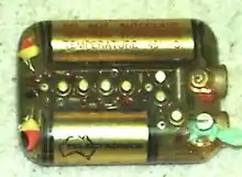 Research also included dissection and analysis of the failure modes of explanted pacemakers of any manufacturer. Most failures were due to an internal short circuit of one of the cells of the multicell battery due to the growth of metallic dendrites; or the result of water vapour diffusing though the epoxy resin encapsulation.[6] The only suitable cell available at the time was the mercuric oxide-zinc cell, so the battery problems remained. In 1967 Telectronics commenced research into the technologies which could allow hermetic sealing of the pacemaker to preclude water vapour penetration and, as an interim measure contracted AWM a subsidiary of Amalgamated Wireless Australia Limited (AWA) to develop integrated circuits for the electronics. These early integrated circuits were developed by David R Money who later joined Telectronics and later still led development of the cochlear implant for the profoundly deaf.[7] The circuits were analogue type, housed in hermetically sealed ceramic military 'flat packs' with redundant double gold bonding of the terminations. The IC's were first used in the model P7 of 1969.[2]