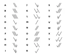 | Morse (c. 1838) | ▄ ▄ ▄ ▄▄▄ ▄ | ▄ ▄ ▄ ▄ ▄ ▄ | ▄ ▄ ▄ ▄ ▄ ▄ ▄ ▄ | ▄ ▄ ▄ ▄ ▄ ▄ ▄▄▄ ▄ | ▄ ▄ ▄ | ▄ ▄ ▄ ▄ ▄ ▄▄▄ ▄ | ▄ ▄ ▄ ▄▄▄ ▄▄▄ ▄ | ▄ ▄ ▄ ▄ ▄ ▄▄▄ ▄▄▄ | ▄ ▄▄▄ ▄▄▄ | ▄ ▄ ▄ ▄ ▄ ▄▄▄ | ▄▄▄ ▄ ▄▄▄ ▄▄▄ ▄▄▄ | ▄▄▄▄ ▄ ▄▄▄ | ▄▄▄ ▄ ▄ ▄ ▄▄▄ ▄ | Serial, variable length | [note 4] | [32] |