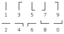 An alternative representation of needle codes is to use the numeral "1" for needle left, and "3" for needle right. The numeral "2", which does not appear in most codes represents the needle in the neutral upright position. The codepoints using this scheme are marked on the face of some needle instruments, especially those used for training.[28]