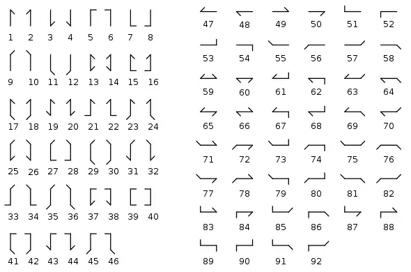 | Myer 2-element wig-wag | 11 22 | 1221 12 | 212 2121 | 111 2122 | 21 122 | 1112 121 | 1122 1 | 211 221 | 2 2111 | 2211 2212 | 1212 1211 | 112 222 | 2112 1111 | Serial, variable length | 1=flag left, 2=flag right [note 1][note 2] | [16] |