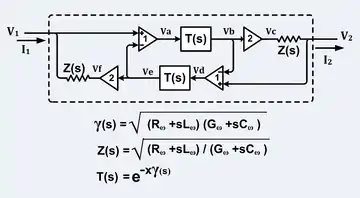 The solutions of the telegrapher's equations can be inserted directly into a circuit as components. The circuit in the figure implements the solutions of the telegrapher's equations.[16]