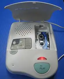 An answering machine, answerphone, or message machine, also known as telephone messaging machine (or TAM) in the UK and some Commonwealth countries, ansaphone or ansafone (from a trade name), or telephone answering device (TAD), is used for answering telephone calls and recording callers' messages. When a telephone rings a set number of times predetermined by the call's recipient the answering machine will activate and play either a generic announcement or a customized greeting created by the recipient.[1] Unlike voicemail, an answering machine is placed at the user's premises alongside—or incorporated within—the user's landline telephone, and unlike operator messaging, the caller does not talk to a human. As landlines become less important due to the shift to cell phone technology, and as unified communications evolve, the installed base of TADs is shrinking.