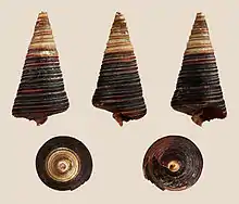 Telescopium telescopium, commonly known as the telescope snail, is a species of snail in the horn snail family Potamididae found in mangrove habitats in the Indo-Pacific.[1] They are large snails that can grow up to 8 to 10 cm (3.1 to 3.9 in) in length and are easily recognizable by their cone-shaped shell.[2][3][4]