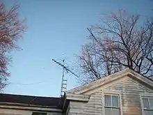 A television antenna (TV aerial) is an antenna specifically designed for use with a television receiver (TV) to receive over-the-air broadcast television signals from a television station. Television reception is dependent upon the antenna as well as the transmitter. Terrestrial television is broadcast on frequencies from about 47 to 250 MHz in the very high frequency (VHF) band, and 470 to 960 MHz in the ultra high frequency (UHF) band in different countries. Television antennas are manufactured in two different types: "indoor" antennas, to be located on top of or next to the television set, and "outdoor" antennas, mounted on a mast on top of the owner's house.[1] They can also be mounted in a loft or attic, where the dry conditions and increased elevation are advantageous for reception and antenna longevity. Outdoor antennas are more expensive and difficult to install, but are necessary for adequate reception in fringe areas far from television stations. The most common types of indoor antennas are the dipole[2] ("rabbit ears") and loop antennas, and for outdoor antennas the Yagi,[2] log periodic,[2] and for UHF channels the multi-bay reflective array antenna.