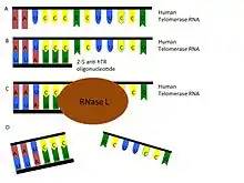 Telomerase, also called terminal transferase,[1] is a ribonucleoprotein that adds a species-dependent telomere repeat sequence to the 3' end of telomeres. A telomere is a region of repetitive sequences at each end of the chromosomes of most eukaryotes. Telomeres protect the end of the chromosome from DNA damage or from fusion with neighbouring chromosomes. The fruit fly Drosophila melanogaster lacks telomerase, but instead uses retrotransposons to maintain telomeres.[2]