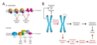 The telomere-shelterin complexes that cap all eukaryotic chromosomes ensure that healthy cells can progress through the cell cycle by preventing the cellular DNA damage response from identifying chromosome ends as double-stranded breaks (DSBs).[4][5] Without a protective cap, chromosome ends would appear identical to intrachromosomal DSBs. These DSBs activate a DNA damage response pathway that halts the cell cycle until the breaks are repaired. This checkpoint pathway is initiated in S. cerevisiae by recruitment of protein kinases Mec1 and Tel1 and in mammals by recruitment of protein kinases ATR and ATM.[6] Regarding DSB repair, eukaryotes generally use two strategies: non-homologous end joining (NHEJ), which involves rapid reattachment of the broken ends; and homologous recombination (HR), which involves the use of a homologous DNA sequence to repair the break. Because HR requires a homologous sequence, its use is restricted to S/G2 phase.[7] (Interestingly, as with many other aspects of the cell cycle,[8] cyclin-dependent kinases are responsible for downregulating NHEJ during S/G2 phase to ensure use of the more accurate HR.[9]) As shown in Figure 1A, telomere-shelterin complexes contain motifs that inhibit the DNA damage checkpoint, NHEJ, and HR.