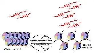 One manner in which chromatin maintains its condensed hetererochromatic state at the telomere is through the enzymes DNA methyltransferases 1 and 3b (DNMT1/3b). Experiments where these factors have been depleted result in increased TERRA expression levels,[18] suggesting that methylation status of the subtelomeric region may help to regulate the expression of TERRA. Further post-translational modifications of telomeric histones may also play a pivotal role in TERRA regulation. Decreased density of trimethylated histones H3K9me3 and H4K30me3 have been shown to correlate with increased TERRA levels.[19] RNA pulldown experiments have also shown that TERRA associates with heterochromatin proteins, including HP1α, HP1β, and the origin recognition complex (ORC).[20] These factors are known to play a role in establishment of heterochromatin and subsequent transcriptional silencing. TERRA-mimicking oligonucleotides have also been shown to associate with other chromatin remodeling complexes such as the NuA Histone Acetyltransferase Complex, BAF-Type SWI/SNF Nucleosome Remodeling Complex, and the NoRC Chromatin Remodeling Complex.[21] It is believed that TERRA may work to stabilize the interaction of these factors with chromatin to promote heterochromatin formation.
