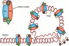 TERRA has also been indicated to be involved with the stabilization of the telomere-protecting Shelterin complex at the ends of telomeres. Evidence shows that TERRA functions together with hnRNPA1 to displace RPA from single-stranded DNA following replication and promotes the loading of the Shelterin component POT1 onto telomere ends.[31] This helps to stabilize the Shelterin complex so that it can properly cap the ends of chromosomes and protect them from recognition by DNA damage signaling pathways.