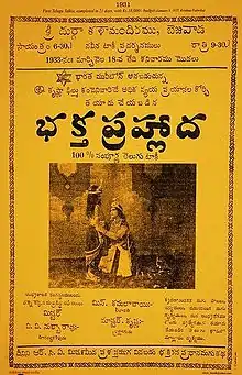 The first Telugu film with audible dialogue, Bhakta Prahlada, was directed by H. M. Reddy, who directed the first bilingual (Tamil and Telugu) talkie Kalidas (1931). Bhakta Prahlada was shot over 18 or 20 days at Imperial Studios, Bombay and was produced by Ardeshir Irani who also produced Alam Ara, India's first sound film.[39] The film had an all-Telugu starcast featuring Sindhoori Krishna Rao as the titular Prahlada, Munipalle Subbayya as Hiranyakasyapa, and Surabhi Kamalabai as Leelavathy.[34] Bhakta Prahlada was completed on 15 September 1931,[40] which henceforth became known as "Telugu Film Day" to commemorate its completion.[41][42][43]