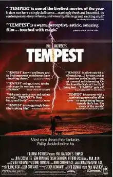 Tempest is a 1982 American adventure comedy-drama romance film directed by Paul Mazursky. It is a loosely based, modern-day adaptation of the William Shakespeare play The Tempest. The picture features John Cassavetes, Gena Rowlands, Susan Sarandon, Raúl Juliá and Molly Ringwald in her feature film debut.[2]