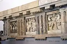 The ten metopai of the facade were sculpted in high relief and framed at the top and bottom by blank slabs which made the relief of the sculpture stand out. The metopes were separated by triglyphs which jut out a long way from the vertical plane of the metopes. Three metopes survive in full: a frontal view of a quadriga being driven vigorously by Helios, Perseus decapitating Medusa while Athena looks on, Heracles carrying the captured Cercopes on his shoulders. In the centre of the tympanum there was the mask of a Gorgon in terracotta.[8]