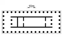 The peripteral temple belongs to the period of transition from the archaic to the classical period. It has a peristyle 25.33 wide x 67.82 metres long with six columns at the front (hexastyle) and fifteen on the long sides. The columns are each 10.19 metres high with numerous traces of the stucco which originally covered them. As a result, the floorplan is unusually elongated. It is a temple characterised by multiple staircases creating a system of successive levels: ten steps lead to the entrance on the eastern side, after the pronaos in antis another six steps lead into the naos and finally another six steps lead into the adyton at the rear of the naos. Behind the adyton, separated from it by a wall, was the opisthodomos in antis. There are many of the optical illusions typical of the Doric order: the strong tapering of the columns at their ends (entasis), contraction at the corners, and widening of the final metopes, for example.[5]
