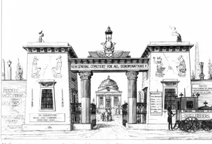 Pugin's caricature of the gates includes a "Shillibeer's Funeral Omnibus". George Shillibeer's invention was arousing some debate in 1843, as had the Newington Academy for Girls in its day (for which he had designed the world's first school bus), and now the new nondenominational park cemetery. All were seen by parts of London society as iconoclastic.