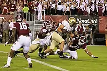 Rhule began the 2015 season by beating Penn State, his own alma mater, 27–10 in front of a sellout crowd of 69,176 – a record for a college football game at Lincoln Financial Field.[21] The win against Penn State was the school's first since 1941. The Owls also set an American Athletic Conference record for sacks in a game by recording 10 against highly touted NFL prospect Christian Hackenberg.[22] One of the 10 sacks came on a two-man rush against Penn State's offensive line and was featured on ESPN's "Not Top 10."[23] The Owls followed up their historic win by going on the road and knocking off American Athletic Conference preseason favorite Cincinnati 34–26.