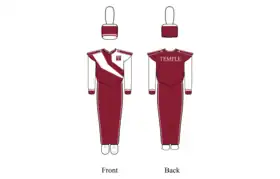 The Diamond Band Uniform consists of cherry red bibbers with a white stripe, a cherry and white coat with the Temple University T on the chest, a shako style hat, and white shoes. The Diamond Band jacket has "TEMPLE" across the back.