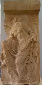 The famous parapet of Nike removing her sandal is an example of Wet drapery.[11] Wet drapery involves showing the form of the body but also concealing the body with the drapery of the clothing. Some friezes are from the Persian and Peloponnesian wars. The friezes contained a cavalry scene from the battle of Marathon and a Greek victory over the Persians at the battle of Plataea. The battles represent Greek and Athenian dominance through military power and historical events.[12] A statue of Nike stood in the cella, or otherwise referred to as a naos. Nike was originally the "winged victory" goddess (see the winged Nike of Samothrace). The Athena Nike statue's absence of wings led Athenians in later centuries to call it Apteros Nike or wingless victory, and the story arose that the statue was deprived of wings so that it could never leave the city.