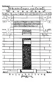 The number 8 seems to reflect a sacred number, since it is used at the entrance, interior pillars (8 × 4), and false windows (8 × 8). Ancient South Arabian buildings, including Awwam peristyle hall, appears to be pre-planned according to a system of prescribed measurements instead of full use of space.[8] AFSM excavation in the paved courtyard revealed multiple South Arabian inscriptions, a group of broken column capitals, bronze plaques, altars, and numerous pottery statues,[9] along with potsherds that date back roughly to 1500–1200 BCE.