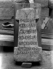 The Altar to Iarhibol was found at the entrance of the Temple of Bel by the Yale-French excavation team in the years of 1928-1929. The inscription on this Altar was inscribed in Greek by a Roman Commander, Skeibonios Moukianos, which reads: "To the god Iarhibol. Skeibonios Moukianos, the tribune, made this on command (of the god)." However, literal translations of the Greek suggest that Skeibonios is a misspelling for the Latin name Scribonius and that the transcription for Moukianos reads as Mucianus based on the evidence from the military parchments found from the excavation site.[5] The inscription on the altar tells that a Latin-named Commander of a Roman army wrote his inscription to Iarhibol in Greek. Scribonius Moucianus, a Greek descendant who held a position of power in a Roman army. The inscription likely dates to around 165–256 CE. However, another translation offered for the text on the altar is as follows: "[For] the god Iarhibol, Scribonius Moucianus, chiliarch, made this as commanded." Thus, a Latin-named dedicant, who holds a Greek-titled office in the Roman army, records his offering to the Palmyrene god Yarhibol in Greek."[14] The fact that the term Chiliarch refers to the commander in a Ancient Macedonian army raises more questions about who the inhibitors of Temple might have been.
