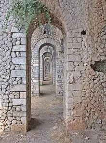 The temple was built between the mid-second and mid-first century BC and is dedicated to Jupiter, who was the protector of Anxur.[2] It was located along the Via Appia which passed through the city of Terracina and is situated atop Mount Sant’Angelo. The site is erected on top of a terraced platform that uses opus incertum. The largest temple is dedicated to Jupiter while a smaller temple dedicated to Venus Obsequens ("Indulgent Venus") sat next to it. After the Roman period, the sanctuary was destroyed.[3] The remains were known in the medieval times as “Theodoric’s palace,” and in the early Middle Ages, a monastery dedicated to St. Michael the Archangel occupied the smaller temple. The interior was transformed into a church, and 9th-century frescos can still be found inside. The first excavations of the temple date to 1894 by Pio Capponi.[4]