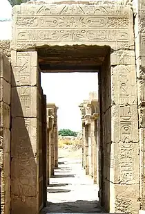 The second and fourth gateways contain cartouches in the name of Shabaka. The third gateway cartouche is in the name of Ptolemy XIII. The fifth gateway leading to the portico columns of Ptolemy III contains the title of Tuthmosis III and on the gate contains the name of Ptolemy III.