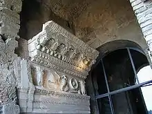 The cella (inner) walls were in travertine, lined with marbles imported at great expense from the eastern provinces.[8] The interior is highly ornate and the frieze depicts sacred objects that would have been used as the symbols, or badges, of the various priestly collegia in Rome.[8] Around 200 to 205, Emperors Septimius Severus and his son, Antoninus Caracalla, conducted renovations on the temple.[9]