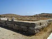 The Temple of the Delians is a Doric peripteral temple, with 6 columns on each short side and 13 columns along each length. The cella is aligned opening to the west with a pronaos and an opisthodomos, both distyle in antis. The temple foundations measure ca. 30 x 13 meters overall.[1]