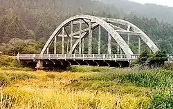 The bridge carries U.S. Route 101 over Tenmile Creek. McCullough designed the structure in 1931. Built of reinforced concrete through a tied arch, the total length of the bridge is 180 feet (55 m) with a main span of 120 feet (37 m). Ornate precast concrete railings run along the sides.[2]