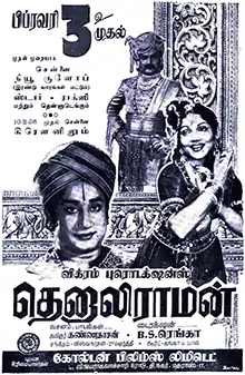 Tenali Raman is a 1956 Indian Tamil-language historical drama film produced and directed by B. S. Ranga based on Ch. Venkataramaiah's stage play Tenali Ramakrishna. Produced for the banner Vikram Productions, the film stars N. T. Rama Rao, Sivaji Ganesan, V. Nagayya, P. Bhanumathi and Jamuna. Ranga also handled the cinematography while P. G. Mohan edited the film. Viswanathan–Ramamoorthy composed the soundtrack and background score.