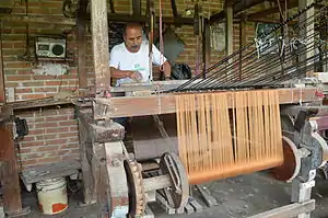 There are several notable rebozo weavers in Tenancingo. One of these is Evaristo Borboa, who received a National Galardon from the federal government for his work in 2014. His work has been exhibited in Mexico and abroad, in such countries as Japan and Germany.[18] He has worked as a weaver all his life, starting when he was eight years old and is only one of two in Tenancingo who weaves with a backstrap loom (along with Salomon Gonzalez Pedraza) .[3][13][18] He uses commercially made cotton thread and used to use natural dyes but has since switched to synthetics. Most of Evaristo's buyers are foreigners because of the publicity he has received. He has said that he will die with threads in his hand and knows the exact number of threads in each rebozo he makes.[19] Another notable rebozo maker is Luis Rodriguez Martinez, who distributes his ware in various parts of Mexico including Puebla, Oaxaca, Morelos, Michoacán, Guanajuato, Guadalajara and Mexico City.[1]
