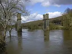 After closure, a goods service was retained on the branch only as far as Tenbury from Bewdley. All connections with the Shrewsbury and Hereford main line had been removed at Woofferton on 12 November 1961. The goods service to Tenbury was withdrawn on 6 January 1964. The goods service to Cleobury Mortimer and Ditton Priors continued, but that business dwindled further, and on Good Friday 16 April 1965, from which date only the dismantling traffic continued.[30][14] With lifting of the track completed, the spans of Dowles Bridge were dismantled in March 1966 leaving only the supports standing in the river.[31]