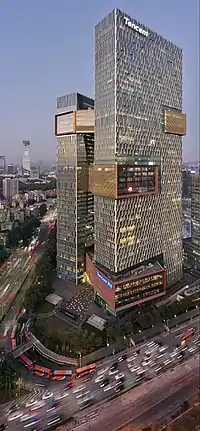 Tencent Binhai Mansion (Chinese: 腾讯滨海大厦), or Tencent Seafront Towers, are twin skyscrapers in Houhai, Nanshan District, Shenzhen, China. Construction of the buildings started in 2012. They were topped out in February 2015 and fully completed by the first half of 2017.[1] The buildings are owned by Tencent, one of the largest Chinese technology and Internet companies, the world's largest investment, gaming and entertainment conglomerate, and Asia's most valuable company.[2][3] Situated at the intersection of Binhai and Nanhai Boulevards, the buildings stand 248 and 194 meters tall, with 50 and 41 floors respectively.[4][5] There are three skybridges connecting the two towers.[6]