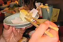Cooked pieces of tempura are either eaten with dipping sauce, salted without sauce, or used to assemble other dishes. Tempura is commonly served with grated daikon and eaten hot immediately after frying. In Japan, it is often found in bowls of soba or udon soup in the form of shrimp, shiso leaf, or fritter. The most common sauce is tentsuyu sauce (roughly three parts dashi, one part mirin, and one part shōyu). Alternatively, skim tempura may be sprinkled with sea salt before eating. Mixtures of powdered green tea and salt or yuzu and salt are also used.[17] Kakiage is a type of tempura made with mixed vegetable strips, such as onion, carrot, and burdock, and sometimes including shrimp or squid, which are deep fried as small round fritters.