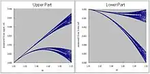 - A closer look at the orbit diagram shows that there are 4 separated regions at μ ≈ 1. For further magnification, 2 reference lines (red) are drawn from the tip to suitable x at certain μ (e.g., 1.10) as shown.