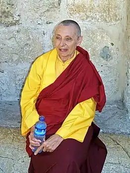 Jetsunma Tenzin Palmo (born 1943) is a bhikṣuṇī in the Drukpa Lineage of the Kagyu school of Tibetan Buddhism. She is an author, teacher and founder of the Dongyu Gatsal Ling Nunnery in Himachal Pradesh, India. She is best known for being one of the very few Western yoginis trained in the East, having spent twelve years living in a remote cave in the Himalayas, three of those years in strict meditation retreat.