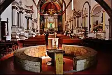 On the right side there is an altar with a sculpture of Christ, another of the Our Lady of Sorrows with four young girls dressed in black, and St. Dimas (the Good Thief). There is also a 20th-century Sacred Heart of Jesus; the original was destroyed during the Mexican Revolution.[4]