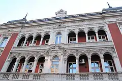 - Hotel Balkan (1935); right across the Hotel Moskva; originally a one-story building built in 1860 on the location of the Simina Kafana, opened by Sima Mehandžija in 1848.[12] It was demolished in 1935 when the present building of the hotel was constructed, work of architect Aleksandar Janković;[29] The old building was also known as the Simina mehana ("Sima's meyhane") and was the gathering point for the volunteers during the Serbian-Turkish wars;[15] Singer Zdravko Čolić recorded a song about the hotel in 2000;[29][64]