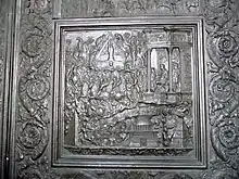 Some examples are the Stefaneschi Polyptych by Giotto;[9] a polyptych by Jacopo di Cione; one tile of Filarete's Bronze Doors in Old St. Peter's Basilica; the frescoes on the vaults of the Basilica of San Francesco in Assisi by Cimabue;[8][10] and possibly the fresco of The Vision of the Cross in Raphael's Rooms in the Vatican.