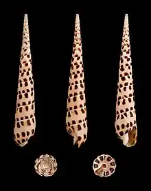 Shells of Terebra subulata can reach a length of 115 mm (4.5 in) and a width of 16 mm (0.63 in).[2] They have about 25 well-rounded whorls and a pointed spire. The aperture is very small and the outer lip is thin. The columella is twisted and the fasciole small. The anterior canal is truncated and curved. The shell is sculptured with fine axial threads and irregular weak spiral grooves, and the area below the suture raised into a spiral band. The color of the shell is cream with two rows of dark brown square blotches on the early whorls and three rows on the body whorl.[3]