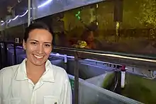 At the Museo de Historia Natural Alcide d'Orbigny (MHNC), she leads the K'ayra Center, which houses and breeds endangered Bolivian frogs.[2][1] In 2018, the museum used a Match.com profile for its solitary Senhuencas water frog, "Romeo," to raise awareness of the species' plight and funds for an expedition to find him a mate.[3] Romeo had been found in 2009 by Camacho Badani, and was thought to possibly be the last of his species. Camacho Badani led the resulting expedition into a Bolivian cloud forest and found a suitable female Senhuencas water frog, which was named "Juliet," along with another female and three males.[4][5]