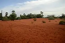 Teri or Teri dune complex is a coastal landscape peculiar to some parts of Tamil Nadu mainly in southeastern India. The landscape consists of sediments dating to the Quaternary Period and made of marine deposits with aeolianite and characteristic red sand and silt dunes. These red soils are thought to have originated in the Pleistocene.[1] Robert Bruce Foote hypothesized that these dunes were created by the action of winds (aeolian) lifting the fine silt fraction from further east.[2] These dunes are oriented along the axis running parallel to the coast and between the latitudes of 8°00′ to 9°30′ N and longitudes 77°18′ to 79°00′ E. The soils also have calcium deposits replacing the old roots of vegetation.[3] The soil is rich in ilmenite and the red colour is derived from haematite originating from garnet.[4][5][6]