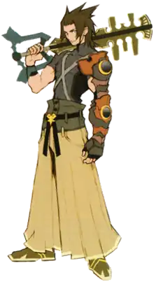 Out of the three protagonists from Birth by Sleep, Terra's design was the only one Nomura decided on from the start, with Nomura stating Terra would be designed younger than shown in previous games.[22] Japanese-inspired designs were incorporated into Terra's outfit based on the "master and apprentice" relationship featured in the game.[23] Nomura had troubles designing Terra's, Ventus's and Aqua's armors due how they would be able to summon them.[24] Therefore, an "X" was added to their clothes as a means of activating the armors as well as due to the fact it was one of the game's keywords. Ever since development of Birth by Sleep started, the staff already decided that the three stories would be told in separate scenarios, with Terra's story being the first one written. Nomura wrote Terra's conversation with Riku early on development, wishing to explain the reason for Riku's ability to use the Keyblade, and he requested the staff in charge to make it into the game. The staff also wanted to emphasize the lack of coincidences in the series, leading to the characters' interaction between the three scenarios. Nomura recommended players to first play as Terra in Birth by Sleep in order to understand the story better. Terra's gameplay was also described by Nomura as "heavy" in comparison to Ventus's and Aqua's.[24]