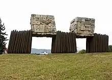 Terra Incognita, designed by Ilan Averbuch, was installed at North Broadway and North Larrabee Avenue, at the foot of the Broadway Bridge, in Portland's Rose Quarter in 1995. The gate-like sculpture is made from steel, wood, stone and copper, and measures 15 feet (4.6 m) x 40 feet (12 m) x 6 feet (1.8 m).[1][2] It forms five cubes in a "strong positive negative pattern".[2] The three base cubes are bundled tree trunks, and the two cubes suspended by the lower three are stone piles. According to the Regional Arts & Culture Council, which administer the sculpture: