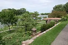The Japanese garden on the eastern side of Covell Lake includes trees and other vegetation from Japan and the local Great Plains region. Some species featured include Black Hills spruce, honeysuckle, silverweeds, cranberries, hydrangeas, and cherry trees. The garden also features stone walls crafted of local Sioux quartzite that expand on the existing terraces, urns made of stone from the Bighorn Mountains, and decorative stones taken from a stream near Buffalo Bill's grave in Wyoming. Other decorations include wooden pergolas and pagodas, stone lanterns and archways, a stone teahouse, waterfalls, and wooden bridges over small stone-lined pools.[1]