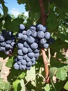 Terret noir is a dark-skinned French wine grape variety grown primarily in the Rhône valley region of France. It is a mutation of the old Vitis vinifera vine Terret.[1] It is a permitted blending grape for Châteauneuf-du-Pape. Like the related Terret gris and Terret blanc, the vine tends to bud late and grow vigorously. Terret noir produces a light color wine that is perfumed and tart.[2]