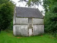 The small, irregular, octangular 14th-century vaulted tower has a splayed base[4][5] and is constructed of courses of square ashlar masonry,[6] 6 m (20 ft) high, with walls 2.0m thick, is the earliest part of the structure, together with the wide wall at the north-west. The tower was vaulted, with three ribs, and an entrance from the courtyard via a narrow passage leading to a partly surviving wheel-stair.[4] The remains of outbuildings lie to the north and a well was recorded within the keep; a sizeable courtyard lay within the complex.[7] The remains have seen some restoration[8] and the lines of excavation trenches are apparent. The whereabouts of the records of the late 19th-century excavations is not known for certain.[9]